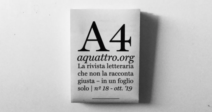Due battute con A4 Che poi uno a rispondere si emoziona tutto… Grazie ancora ad A4 e Stefano Amato per lo spazio concesso, il tempo e l’attenzione. Qui la breve intervista. Condividi: Fai clic per condividere su X (Si apre in una nuova finestra) X Fai clic per condividere su Facebook (Si apre in una nuova finestra) Facebook Fai clic per inviare un link a un amico via e-mail (Si apre in una nuova finestra) E-mail Fai clic qui per stampare (Si apre in una nuova finestra) Stampa Mi piace Caricamento...