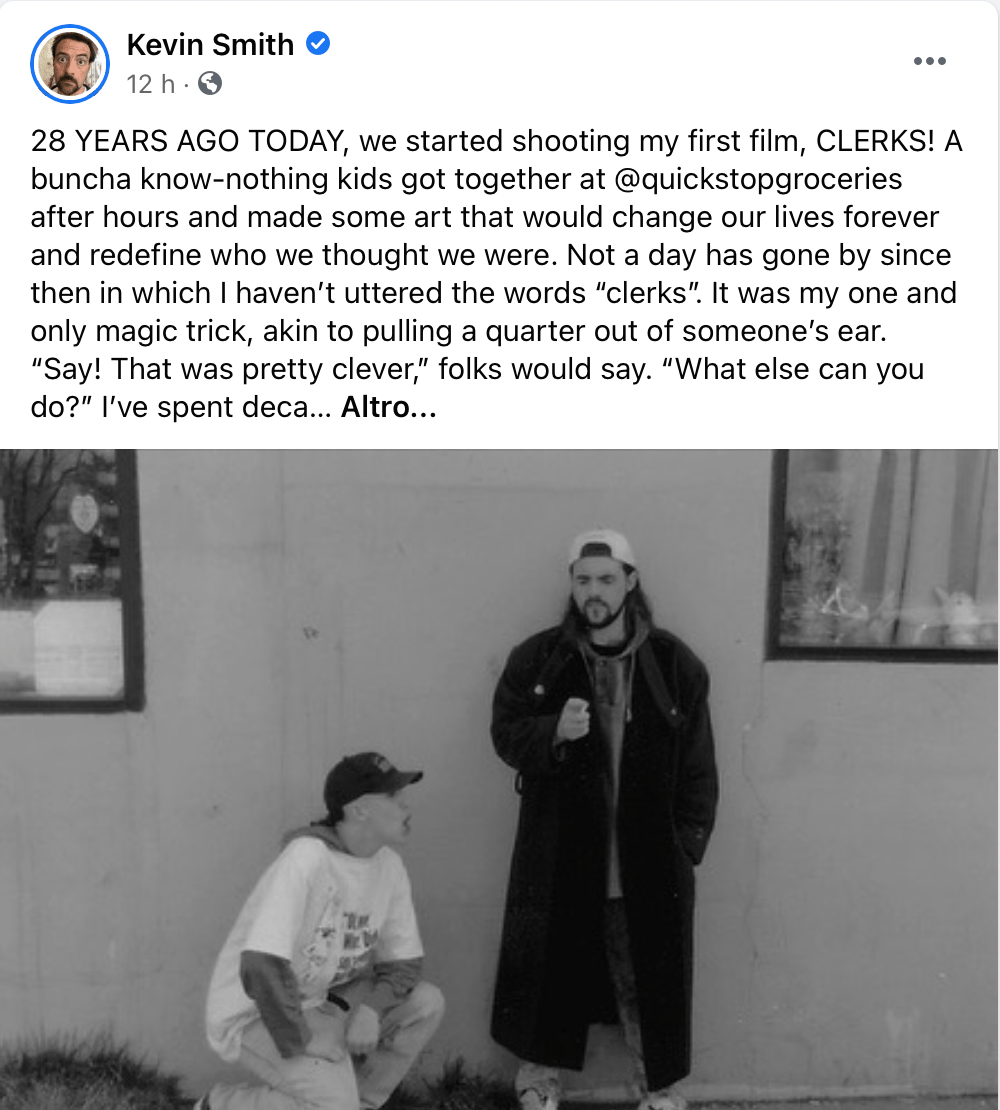 Io me lo ricordo perfettamente. 27 anni fa entrai al cinema Salamandra di Siracusa – un vecchio cinema porno trasformato in sala d’essai – a vedere Clerks di Kevin Smith e da quel momento, nella mia vita ci fu un “prima di Clerks” e un “dopo di Clerks”. Per non parlare delle serate a Bologna, trascorse con Stefano a trascriverne i dialoghi, impararli a memoria e recitarli da soli o nel mezzo di discussioni anche tra estranei, solo per vedere le reazioni della gente. Ci intitolammo anche una canzone, forse la più spontanea, potente e immediata che riuscimmo mai a comporre. Una specie di omaggio, un tributo che dopo tutti questi anni suona ancora bene.
