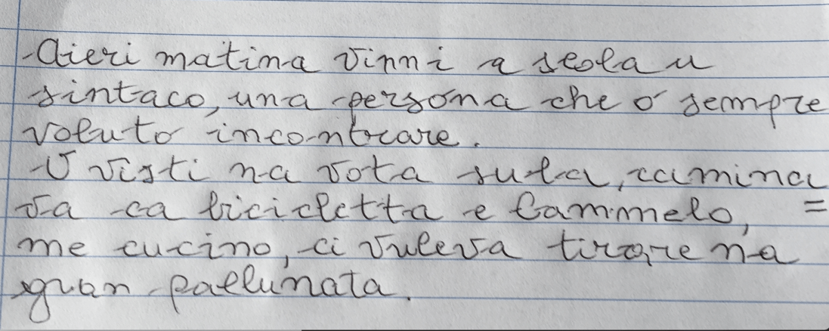 Aieri matina vinni a scola u sintaco, una persona che o sempre voluto incontrare. U visti na vota sula, caminava ca bicicletta e Cammelo, me cucino, ci vuleva tirare na gran pallunata. Iu ci rissi, statti femmu, è il mio itolo. Dice che a venuto a scola pi fari l’inaugurazione delle nuove classi che ci anno dato per la scola e ora a detto il sindaco e anche la presite, bonu chiù coi doppi turni che mio padre, che di pomeriggio si cucca, si era scassato la minchia. Mi ho messo seduto a sentire che diceva e a aspettare di fare un seffi. Dopu vinti minuti ancora parrava e mi stava calannu u sonnu, poi ha dittu: “avanti, facemuni sti fotografie… chi si voli fari a fotocrafia col sintaco?”. Allora tutti i picciotti sana susutu e sana misu in fila iu era tezzuttimo. Il mio cuore si e riempito di gioia quanto il Sintaco ha detto: “aspè, prima facemu chiddi abbuddati”. Allora ci scippai re manu u telefono a Rizzo ra tezza B ca è testiminchia e mi ci appresenti davanti e ci rissi: “sintaco, grazie per quello che fai della città…”. E lui mi a sorriso e mi ha detto: “preco e il mio dovere”. Allora io ci o detto: “Ma si può fare Sferaebasta atteatrogreco, ava!” E iddu dici: “Ci proviamo…”. Poi mentre tutti u chiamavano i tutti i lati, pigghia e mi fa: “ma tu comu ti chiami?” e io tutto emozionato ce l’ho detto: Uilliam Tiralonco.
