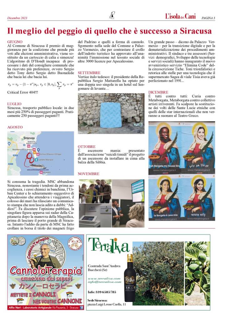 A tutti i folli, i solitari, i pitarri, gli spittuni e la gente per bene. Quelli con le quattro frecce fermi sulle strisce pedonali e quelli manco le mettono; quelli che è tutto un pretesto e quelli che questo lo dice lei; quelli che restiamo umani e quelli che di umano hanno ben poco; quelli che le piste ciclabili non passa l’ambulanza e quelli che ci vanno con lo scooterone; quelli che non raccolgono la cacca del cane e quelli che la pestano; quelli che telefonano ai Vigili Urbani e non risponde mai nessuno; quelli che si svegliano presto; quelli che annaffiano le piante nei vicoli di Ortigia o sui balconi di Neapolis; quelli che differenziata non ne faccio perché tanto poi buttano tutto assieme; quelli che non pagano la Tari; quelli che lavorano coi bambini dei quartieri a rischio; quelli delle apicalessino e quelli dei boat tour; quelli che a Capodanno hanno dieci gruppi su WhatsApp e poi non fanno niente; quelli che solo caipirinha alla fragola e quelli che la Vecchia Romagna già nel primo caffè del mattino; quelli del cavallo e sbizzero e quelli che ci mettono pure i camperetti. Quelli che corso Gelone è come gli Champs-Élysées; quelli che la pizza non è bruciata, noi la facciamo così; quelli del fritto misto solo coi calamari; quelli che il Corvo glicine caldo a venticinque euro; quelli che cercano sempre di propinarti il cerniotto di venti chili da fare alla matalotta; quelli del Cenone di Capodanno con il crumble, il dressing, il chutney e il cavatello homemade; quelli col pos sempre rotto; quelli che passeggiano quando tira il vento e il lungomare è deserto; quelli che si fregano la tassa di soggiorno; quelli che sparano i fuochi d’artificio ogni notte; quelli che viva Santa Lucia prima Dio e dopo Idda; quelli dei biglietti gratis al Teatro Greco e quelli che pagano sempre; quelli che la zona industriale è ancora la Sincat; quelli che hanno le macchine con l’adesivo Camel Trophy Borneo ‘85; quelli che la tua invidia è la mia fortuna; quelli che solo destagionalizzando e poi non sanno che diavolo vuol dire; quelli che guardano le onde; quelli che aspettano le barche che entrano in porto; quelli che accolgono gli ultimi; quelli che e io pago e poi non pagano mai niente, quelli dei concerti al Teatro Greco e quelli che facciamoli allo stadio; quelli che sono sempre loro e non ce ne libereremo mai, quelli che dicono ambo quando esce il primo numero alla tombola; quelli che hanno sprecato tutte le occasioni; quelli che hanno paura del tempo che passa; quelli che hanno avuto una brutta notizia; quelli che hanno vinto una battaglia; quelli che cercano un cestino; quelli che trovano l’amore; quelli che si ricordano tutto e quelli che non sanno niente; quelli che fotografano la spazzatura e quelli che coi refusi sulle stories di Instagram; quelli che cantano sottovoce; quelli che non sanno perdere; quelli che non sanno vincere; quelli che sono l’opposto di quello che postano; quelli dell’offerta culturale a spese degli artisti; quelli che si credono artisti; quelli che si indignano; quelli che se ne fottono; quelli che scrivono le lettere e quando finisci di leggerle hai gli occhi pieni di lacrime; quelli che sono nati ieri e quelli che sono rimasti bambini; quelli che Siracusa è troppo bella; quelli che si sentono fregati; quelli che sono diventati nonni e quelli che sono rimasti soli; quelli che scappano via e quelli che rimangono qui.