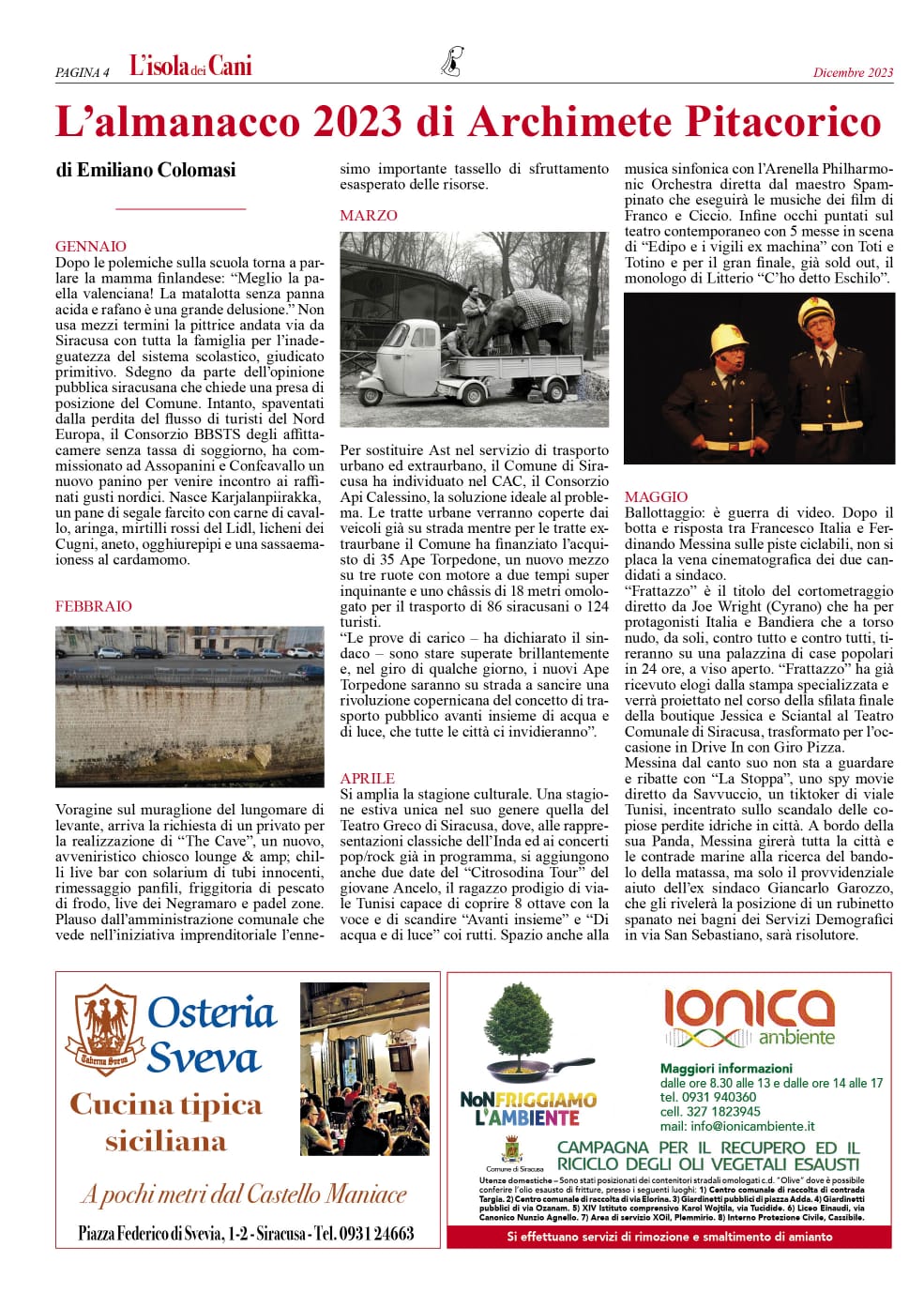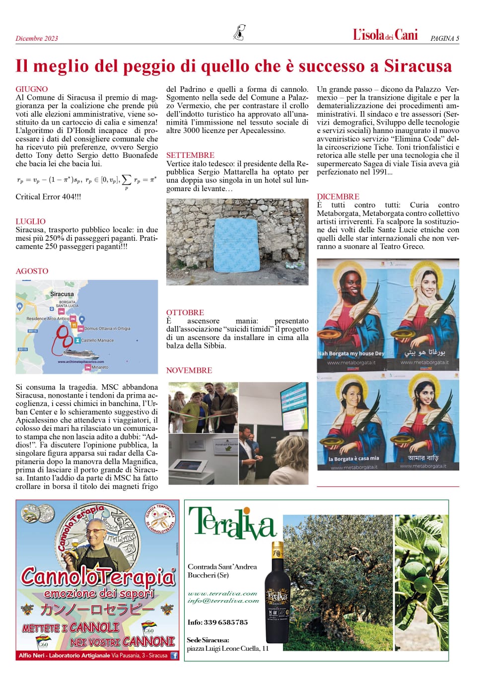 A tutti i folli, i solitari, i pitarri, gli spittuni e la gente per bene. Quelli con le quattro frecce fermi sulle strisce pedonali e quelli manco le mettono; quelli che è tutto un pretesto e quelli che questo lo dice lei; quelli che restiamo umani e quelli che di umano hanno ben poco; quelli che le piste ciclabili non passa l’ambulanza e quelli che ci vanno con lo scooterone; quelli che non raccolgono la cacca del cane e quelli che la pestano; quelli che telefonano ai Vigili Urbani e non risponde mai nessuno; quelli che si svegliano presto; quelli che annaffiano le piante nei vicoli di Ortigia o sui balconi di Neapolis; quelli che differenziata non ne faccio perché tanto poi buttano tutto assieme; quelli che non pagano la Tari; quelli che lavorano coi bambini dei quartieri a rischio; quelli delle apicalessino e quelli dei boat tour; quelli che a Capodanno hanno dieci gruppi su WhatsApp e poi non fanno niente; quelli che solo caipirinha alla fragola e quelli che la Vecchia Romagna già nel primo caffè del mattino; quelli del cavallo e sbizzero e quelli che ci mettono pure i camperetti. Quelli che corso Gelone è come gli Champs-Élysées; quelli che la pizza non è bruciata, noi la facciamo così; quelli del fritto misto solo coi calamari; quelli che il Corvo glicine caldo a venticinque euro; quelli che cercano sempre di propinarti il cerniotto di venti chili da fare alla matalotta; quelli del Cenone di Capodanno con il crumble, il dressing, il chutney e il cavatello homemade; quelli col pos sempre rotto; quelli che passeggiano quando tira il vento e il lungomare è deserto; quelli che si fregano la tassa di soggiorno; quelli che sparano i fuochi d’artificio ogni notte; quelli che viva Santa Lucia prima Dio e dopo Idda; quelli dei biglietti gratis al Teatro Greco e quelli che pagano sempre; quelli che la zona industriale è ancora la Sincat; quelli che hanno le macchine con l’adesivo Camel Trophy Borneo ‘85; quelli che la tua invidia è la mia fortuna; quelli che solo destagionalizzando e poi non sanno che diavolo vuol dire; quelli che guardano le onde; quelli che aspettano le barche che entrano in porto; quelli che accolgono gli ultimi; quelli che e io pago e poi non pagano mai niente, quelli dei concerti al Teatro Greco e quelli che facciamoli allo stadio; quelli che sono sempre loro e non ce ne libereremo mai, quelli che dicono ambo quando esce il primo numero alla tombola; quelli che hanno sprecato tutte le occasioni; quelli che hanno paura del tempo che passa; quelli che hanno avuto una brutta notizia; quelli che hanno vinto una battaglia; quelli che cercano un cestino; quelli che trovano l’amore; quelli che si ricordano tutto e quelli che non sanno niente; quelli che fotografano la spazzatura e quelli che coi refusi sulle stories di Instagram; quelli che cantano sottovoce; quelli che non sanno perdere; quelli che non sanno vincere; quelli che sono l’opposto di quello che postano; quelli dell’offerta culturale a spese degli artisti; quelli che si credono artisti; quelli che si indignano; quelli che se ne fottono; quelli che scrivono le lettere e quando finisci di leggerle hai gli occhi pieni di lacrime; quelli che sono nati ieri e quelli che sono rimasti bambini; quelli che Siracusa è troppo bella; quelli che si sentono fregati; quelli che sono diventati nonni e quelli che sono rimasti soli; quelli che scappano via e quelli che rimangono qui.