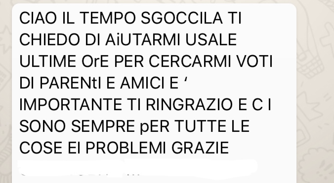 Il tempo sgoccila è vero, ma tu, incurante, hai preferito redigere un messaggio in maiuscolo dimostrando dedizione, impegno e senso di responsabilità nei confronti di tutti noi, i tuoi elettori. Da subito, leggendo il tuo accorato appello, mi sono sentito coinvolto nella tua causa, perchè con poche parole hai abbattuto quelle odiose barriere, quelle differenze che si creano tra il politico e l’uomo comune, mettendomi a mio agio. Purtroppo, il fatto di non conoscerti e la circostanza che militi in uno schieramento con idee molto distanti dalle mie, non mi mette nelle condizioni di poterti aiutare, ma credimi, ti auguro il meglio. Siracusa ha bisogno anche di te, per tutte le cose ei problemi… grazie.