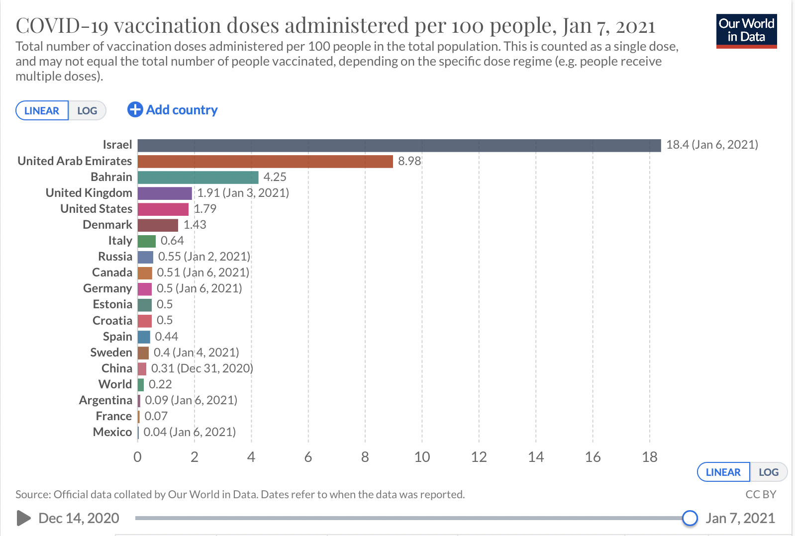 1. l’Italia, su cento persone, ne ha vaccinate 0,64 (dati al 7 gennaio); la Germania 0,5 (6 gennaio)